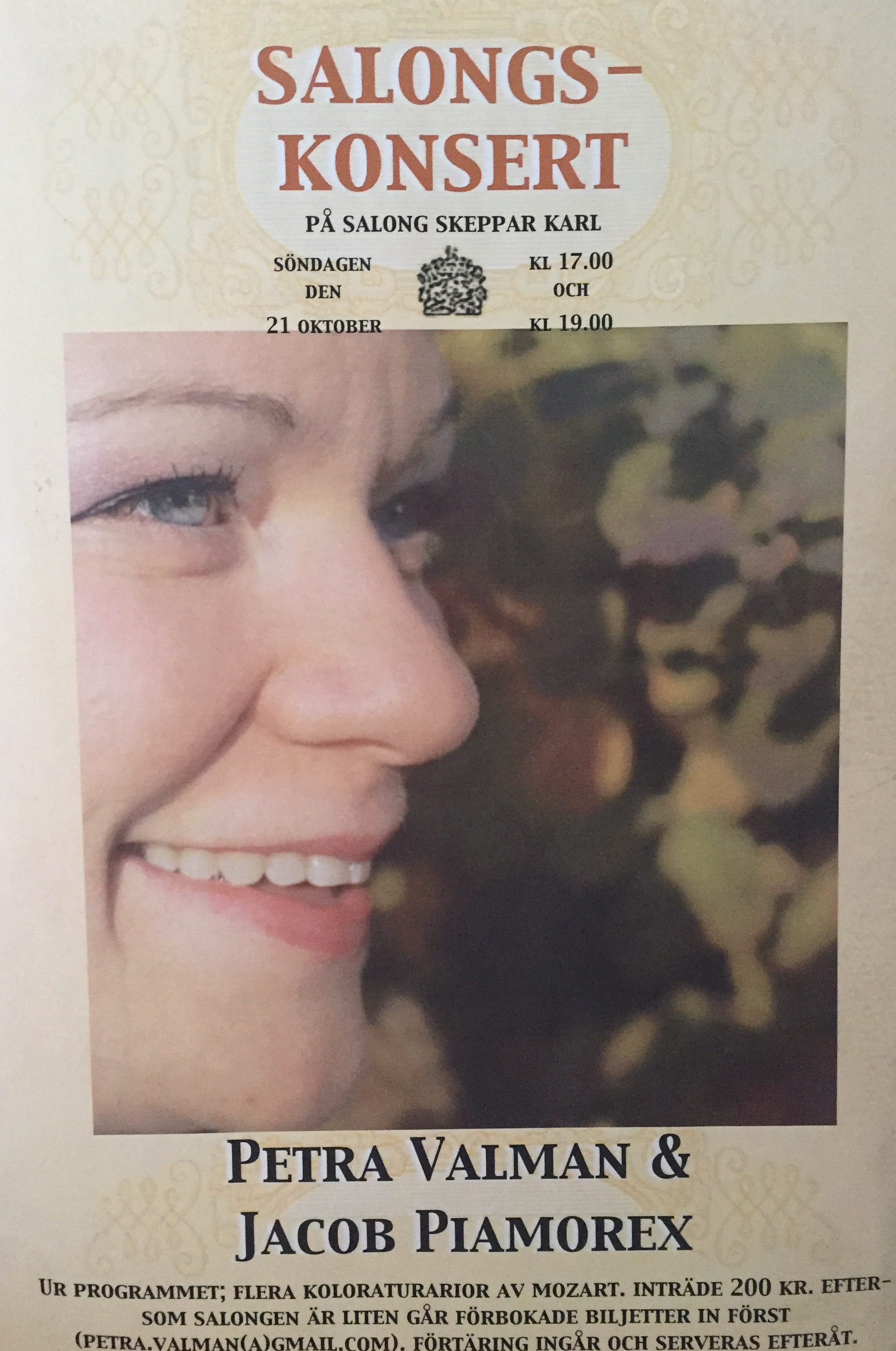 Salongskonsert i september 2018 på Plommonvägen, Knivsta. Sånger ur Sound of music, operapärlor och romanser av Strauss.