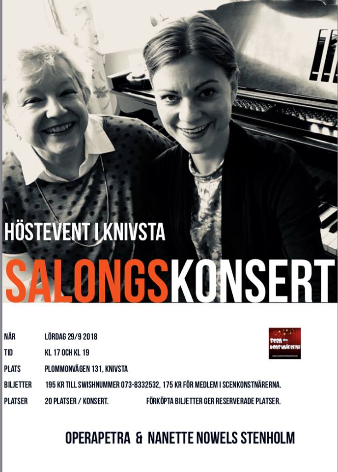 - 29/9-2018 Salongskonsert med pianist Nanette Stenholm och sopran Petra Valman. Plats: Plommonvägen 131, Knivsta