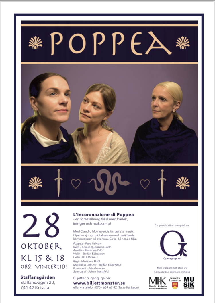 - 28/10-2018 Poppeas kröning av Monteverdi 28/10-2018 kl 15.00 och 18.00 på Staffansgården i Knivsta.