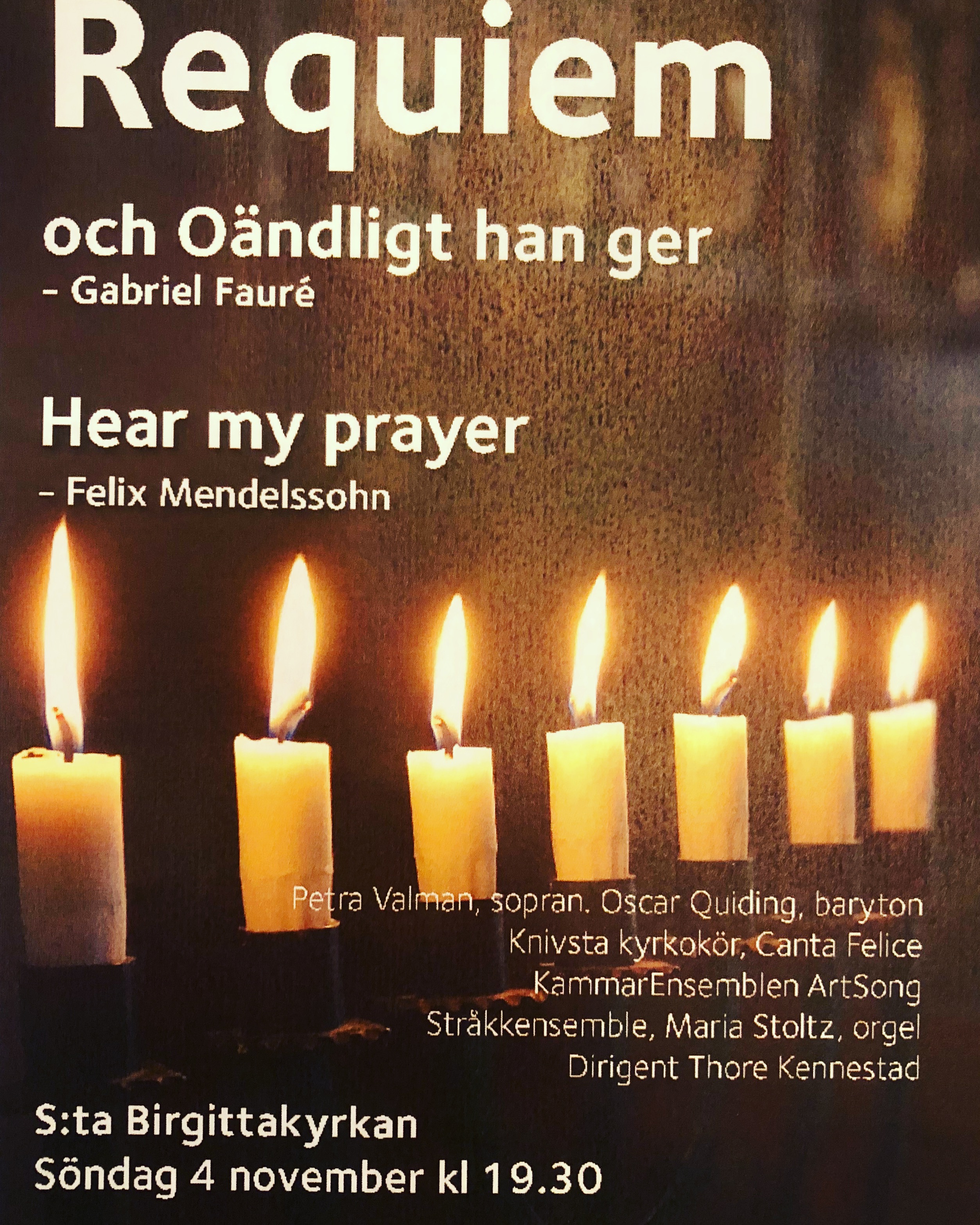 - 5/11-2018 Faurées requiem och Hear my prayer, Mendelssohn, St Birgittakyrkan, Knivsta. Petra Valman. – sopransolist. Oscar Quiding – barytonsolist.