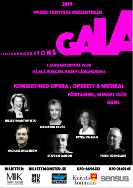 - 5/1-2019 Trettondagsaftonsgala 2019. Arr Musik i Knivsta. Solister; Hillevi Martinpelto, Marianne Eklöf, Petra Valman, Peter Törnblom, Staffan Larson och Michael Engström. Biljetter finns här.